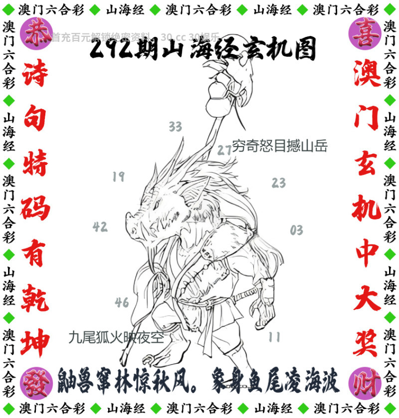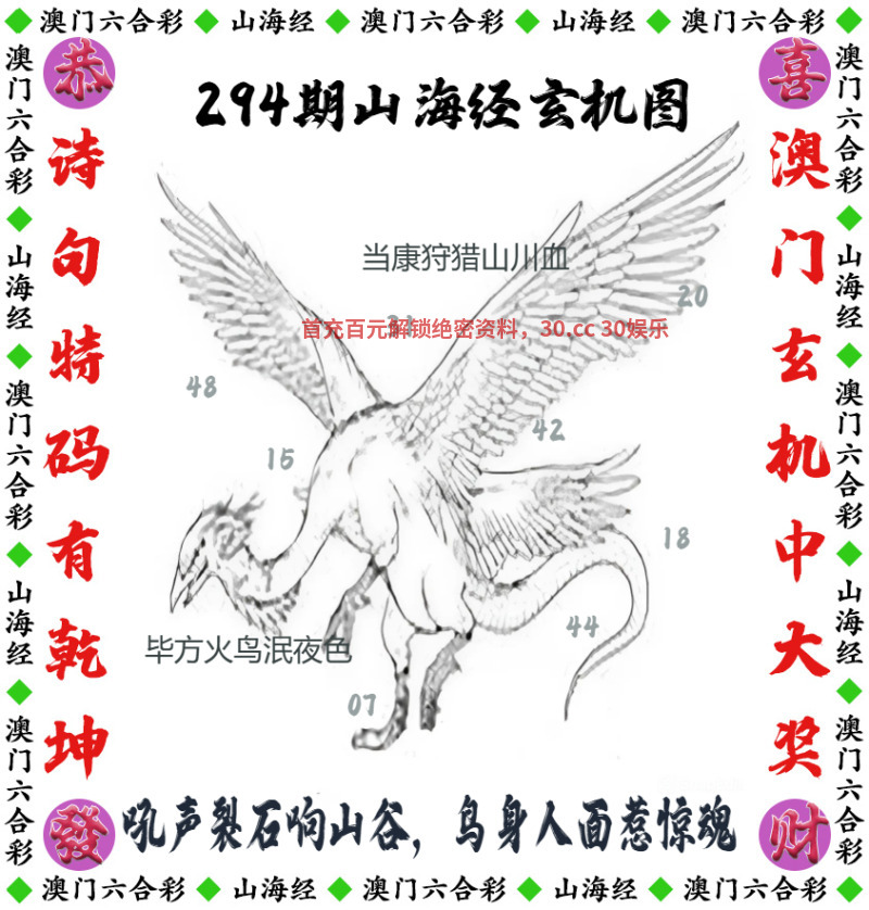 294期:【山海经玄机】开鼠18 解释:当康狩猎山川血,毕方火鸟泯夜色解鼠兔猪 解料:吼声裂石响山谷,鸟身人面惹惊魂解狗牛鸡 综合:鼠狗牛鸡兔猪 主特:18.42.20.44.05.41.09.33.03.15.31.43 |